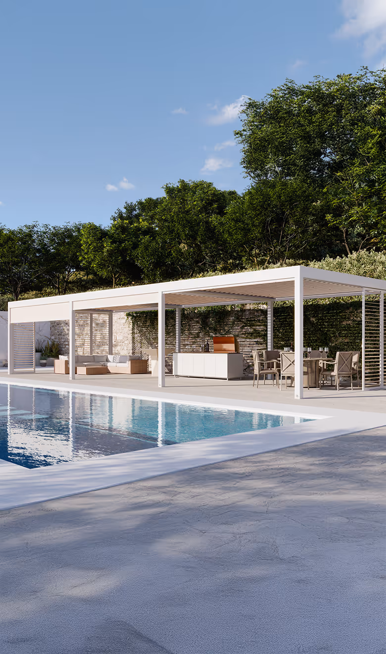 Lamellendächer punkten vor allem durch ihre Flexibilität. Die individuell einstellbaren Lamellen ermöglichen es, den Lichteinfall und die Belüftung je nach Bedarf zu regulieren. Diese Überdachungen sind ideal für wechselhafte Wetterverhältnisse und sorgen sowohl bei starker Sonne als auch bei Regen für den perfekten Schutz – ein stilvolles Highlight für jede Terrasse.
