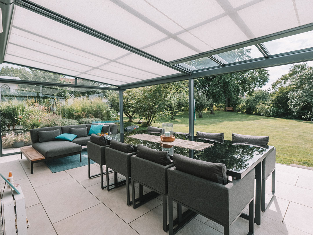 Geschützt vor Sonne, Wind & Wetter. Ein Terrassendach bringt perfekte Wohlfühlatmosphäre, sieht gut aus und verlängert Ihre Terrassensaison bis weit in den Frühherbst.