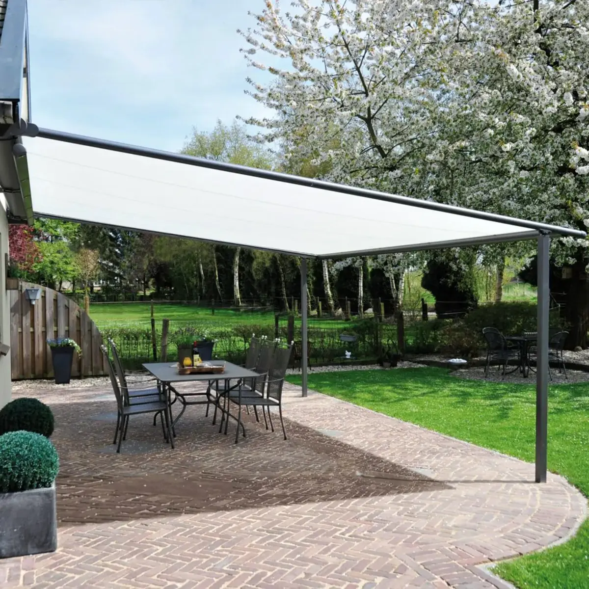 Der Traum für entspanntes Outdoor Living: Schlankes Design und dabei extrem windstabil dank Führungsschienen für das Tuch und festen Stützen am Ende des Ausfalls
