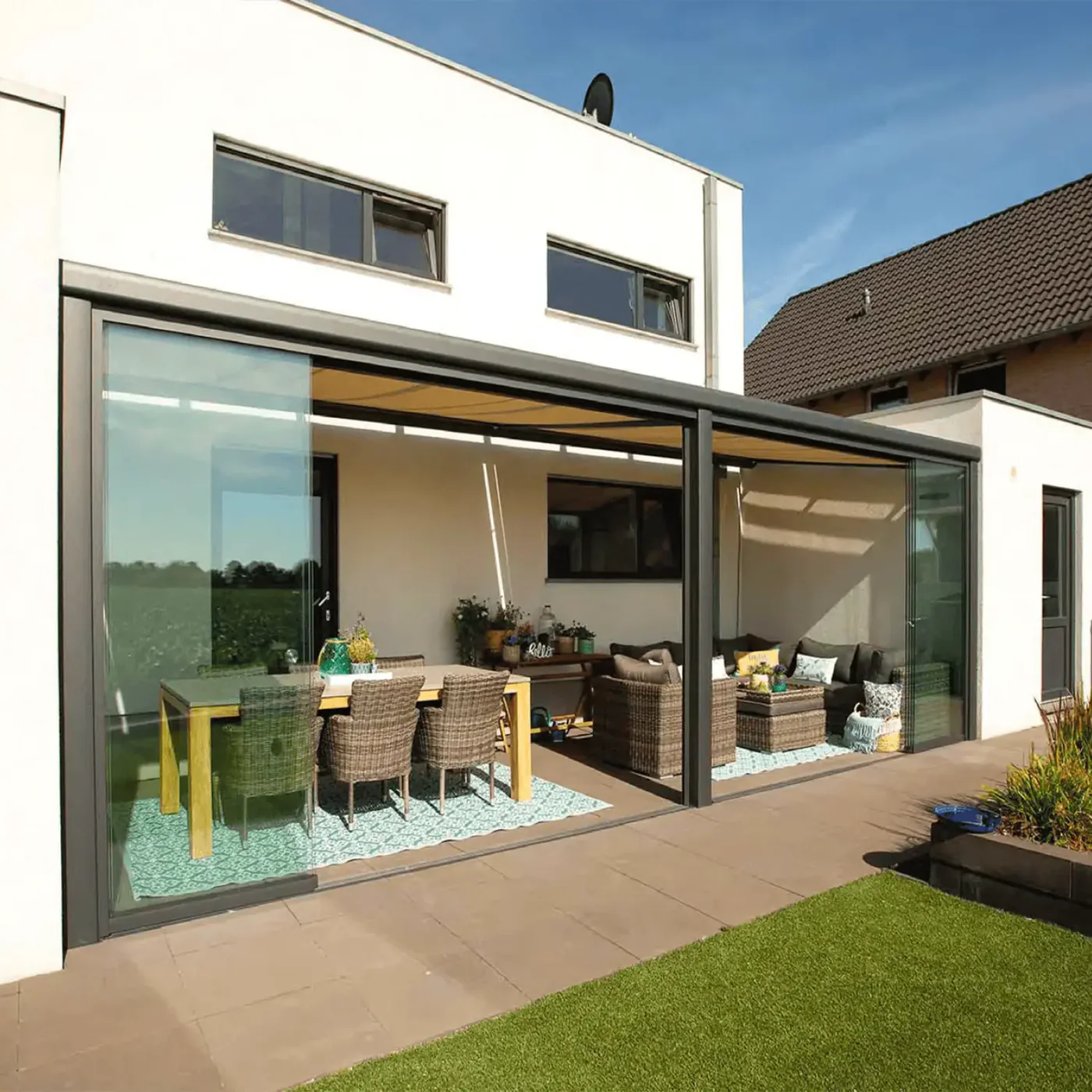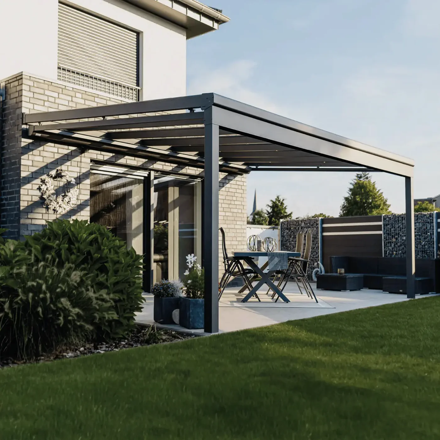 Pulverbeschichtete Aluminiumprofile und witterungsbeständige Materialien sorgen für hohe Stabilität und langfristige Haltbarkeit. Stabile Aluminiumkonstruktion mit verdeckter Regenrinne