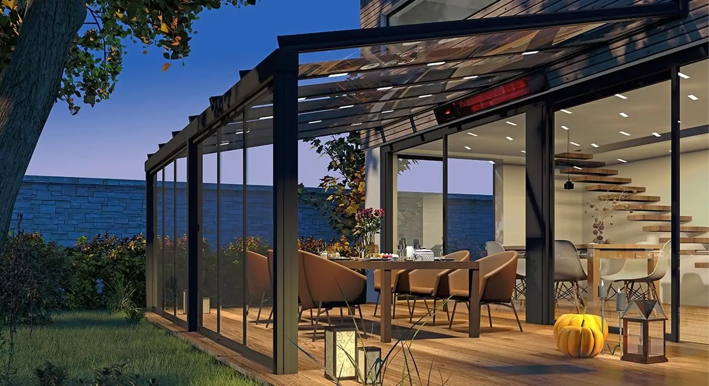 Die Variante Integral überzeugt mit einem versteckten Wasserablauf, der Funktionalität und Ästhetik ideal vereint. Für zusätzlichen Komfort sorgen integrierte LED-Ambientebeleuchtung und Wärmemodule, die Ihre Terrasse bis in die Abendstunden hinein nutzbar machen. Glasschiebeelemente bieten zuverlässigen Schutz vor Wind und Regen, ohne den freien Blick nach draußen zu nehmen.