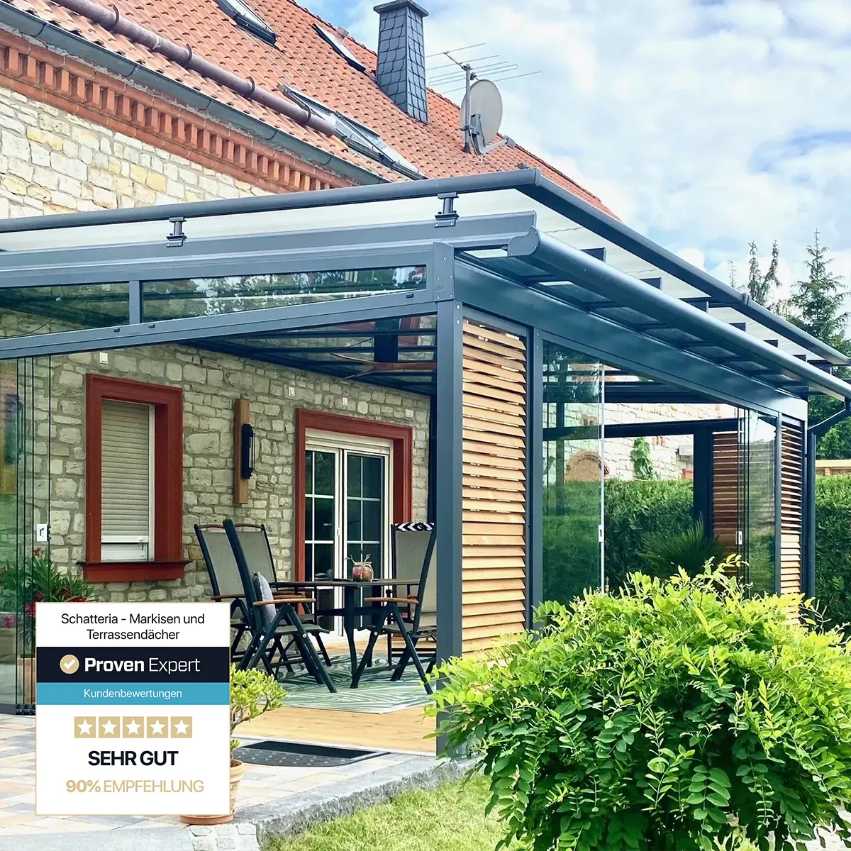 Unser Terrassendach für große Flächen und ungestörten Panoramablick dank großer Glasmodule.