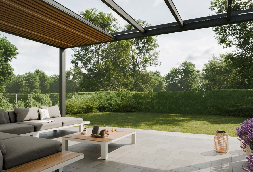 Die elegante, feste Terrassenüberdachung mit maximalem Lichteinfall. Immer hell. Immer geschützt.