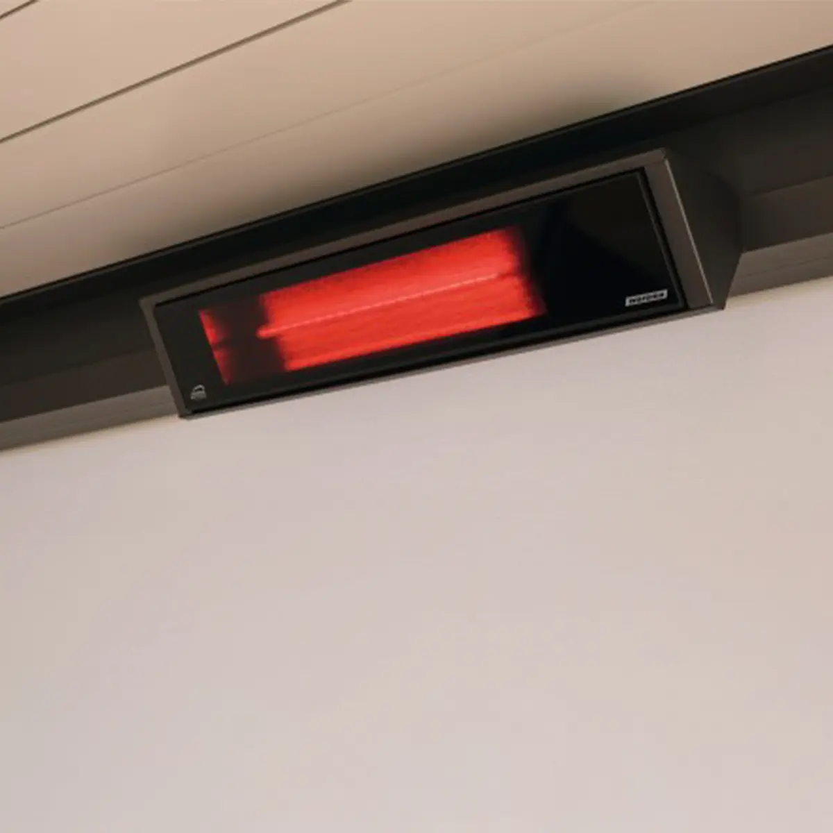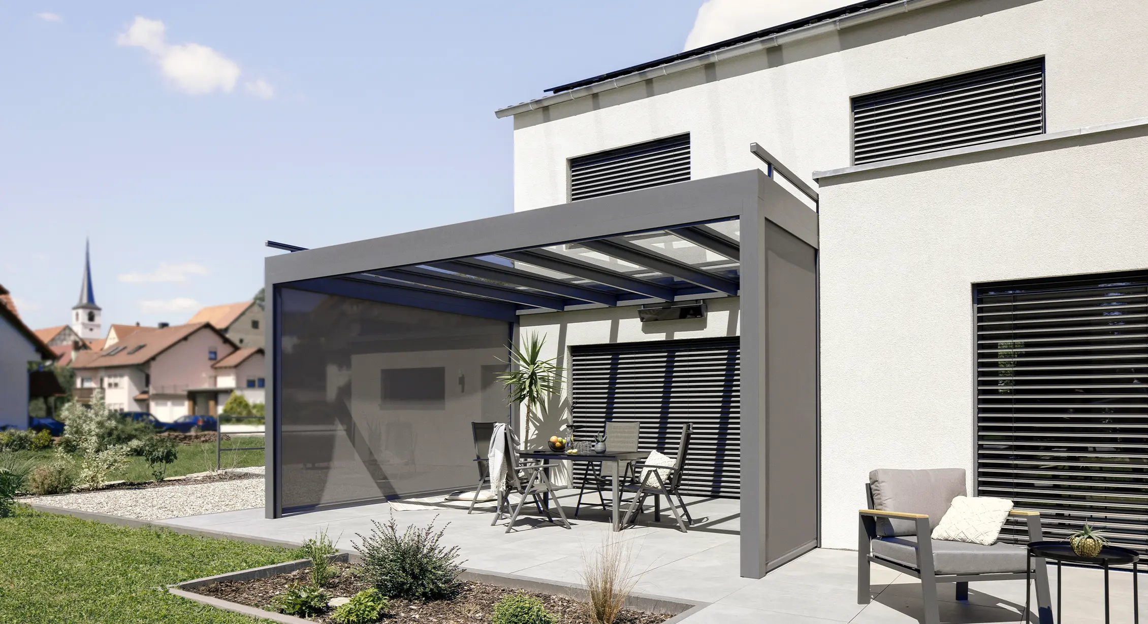 Mit dem optionalen Warema Heizstrahler genießen Sie auch an kühleren Tagen angenehme Wärme – bequem steuerbar per Handsender. Für zusätzlichen Schutz sorgt die Senkrechtmarkise mit easyZIP-Führung, die auch bei Wind zuverlässig stabil bleibt. Ergänzt wird das System durch elegante Glas-Schiebeläden, die Wind und Wetter fernhalten und zugleich für ein offenes Raumgefühl sorgen.
